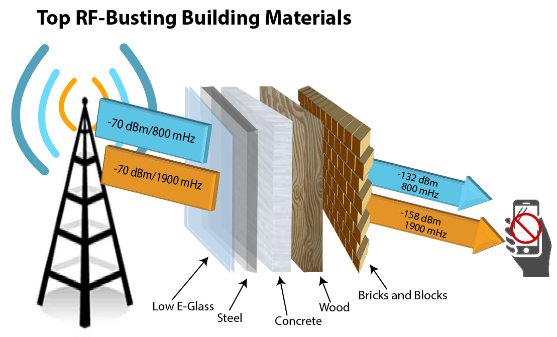 Building materials blocking radio frequency causing a drop in cell phone signal reception strengh